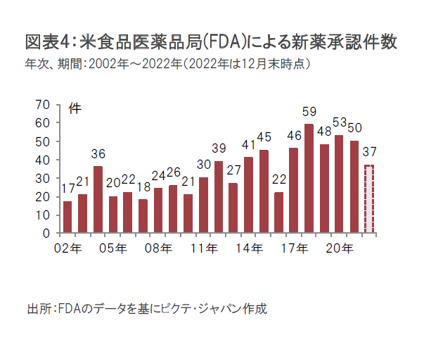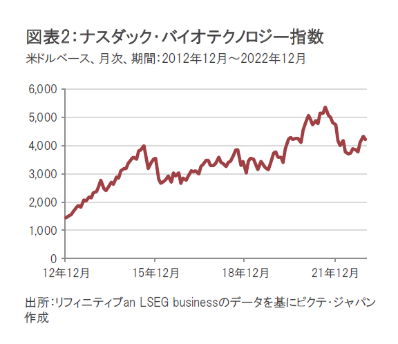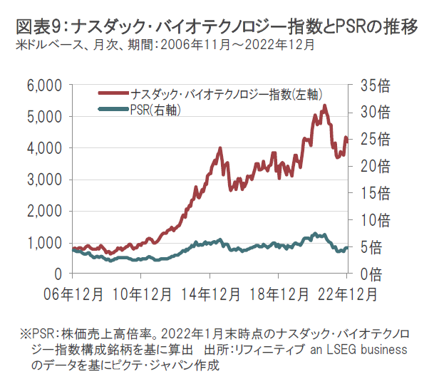 バイオ医薬品企業の業績が景気動向に左右されにくい特性などが注目されて2021年夏頃までは株価が上昇し、PSR(株価売上高倍率)で見たバリュエーション(投資価値評価)の水準も上昇していましたが、2021年秋以降はFDAの承認申請に対する予想外の決定などがマイナス要因となったことに加え、2022年半ばにかけてナスダック市場の下落が大きくなる中、ナスダック・バイオテクノロジー指数も下落したことから、PSRも低下しました。(図表9参照)
