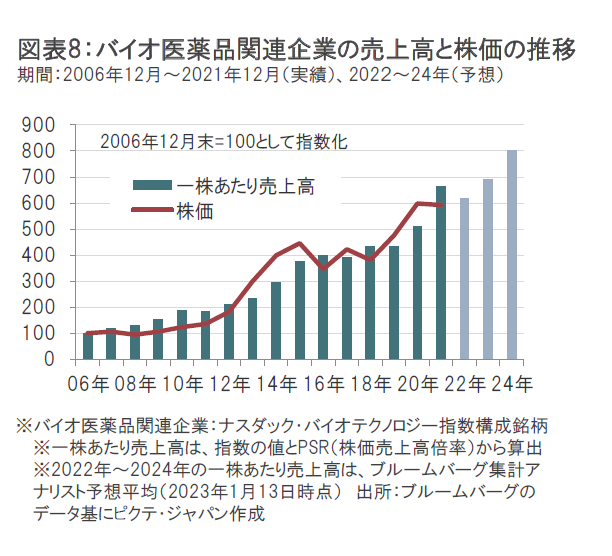過去の実績では、バイオ医薬品関連企業の株価は、売上高の伸びとともに上昇してきたことがわかります。(図表8参照)