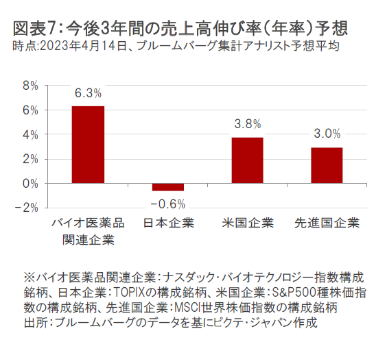 バイオ医薬品関連企業については、引き続き多くの有望な治療薬候補を有しており、新薬承認後の業績寄与が期待されていることから、今後3年間で年率+6.3%の相対的に高い売上高の伸びが予想されています。(図表7参照)