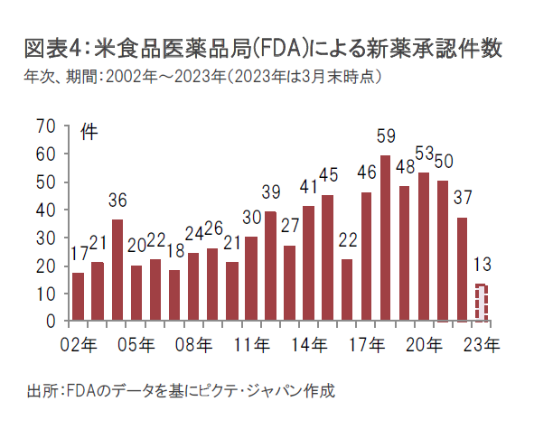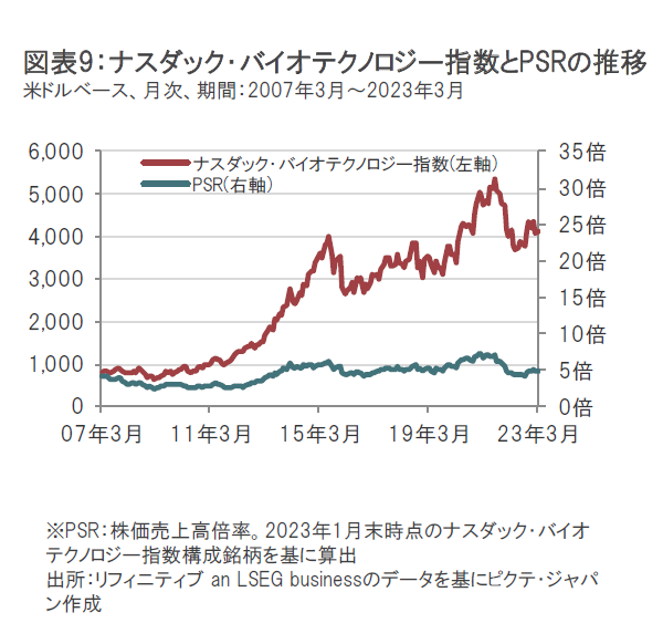 バイオ医薬品企業の業績が景気動向に左右されにくい特性などが注目されて2021年夏頃までは株価が上昇し、PSR(株価売上高倍率)で見たバリュエーション(投資価値評価)の水準も上昇していましたが、2021年秋以降はFDAの承認申請に対する予想外の決定などがマイナス要因となったことに加え、2022年半ばにかけてナスダック市場の下落が大きくなる中、ナスダック・バイオテクノロジー指数も下落したことから、PSRも低下しました。(図表9参照)