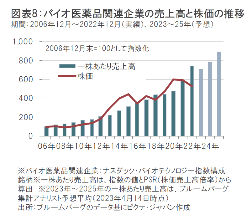 過去の実績では、バイオ医薬品関連企業の株価は、売上高の伸びとともに上昇してきたことがわかります。(図表8参照)