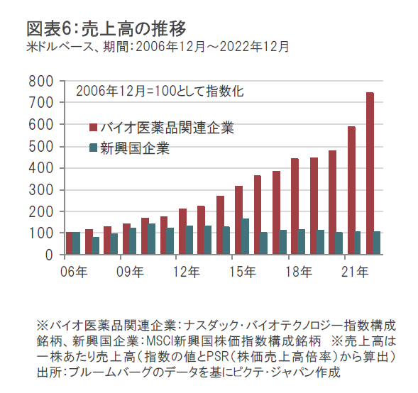 バイオ医薬品関連企業の売上高は、新興国の企業を上回って堅調に成長してきました。(図表6参照)