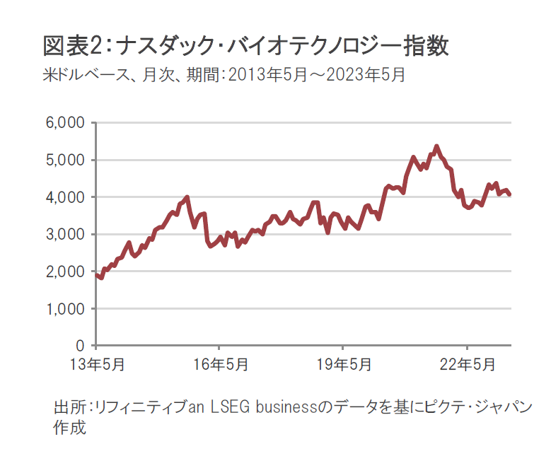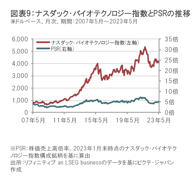 バイオ医薬品企業の業績が景気動向に左右されにくい特性などが注目されて2021年夏頃までは株価が上昇し、PSR(株価売上高倍率)で見たバリュエーション(投資価値評価)の水準も上昇していましたが、2021年秋以降はFDAの承認申請に対する予想外の決定などがマイナス要因となったことに加え、2022年半ばにかけてナスダック市場の下落が大きくなる中、ナスダック・バイオテクノロジー指数も下落したことから、PSRも低下しました。(図表9参照)