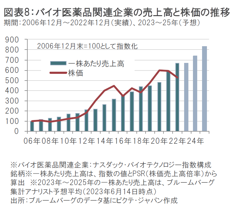 過去の実績では、バイオ医薬品関連企業の株価は、売上高の伸びとともに上昇してきたことがわかります。(図表8参照)