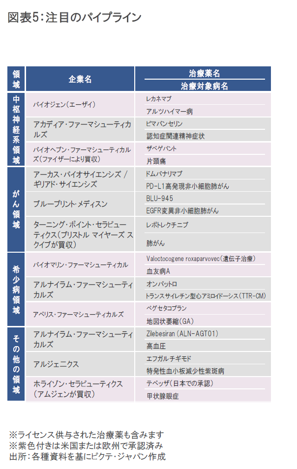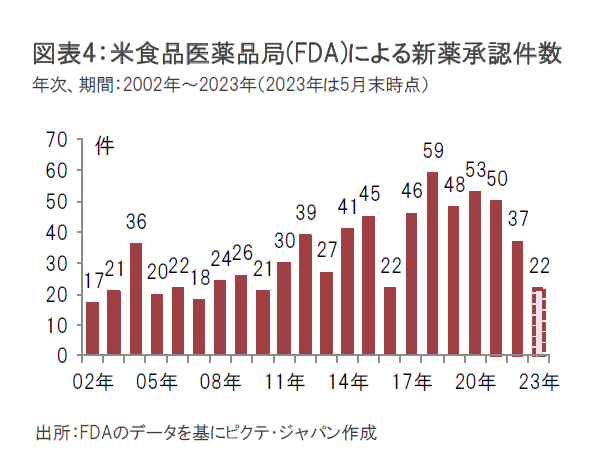 一方、アムジェン(米国)は、1-3月期決算が期待外れだったことに加え、米連邦取引委員会(FTC)が、ホライゾン・セラピューティクス(アイルランド)の買収差し止めを求めて提訴したことが嫌気され、株価が下落しました。またインサイト(米国)はアトピー性皮膚炎治療薬の値下げにより1-3月期売り上げが伸び悩んだことから、アルクティス・バイオセラピューティクス(米国)は乾癬治療薬の1-3月期売り上げが低調だったことが嫌気され、それぞれ株価が下落しました。