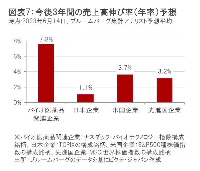 バイオ医薬品関連企業については、引き続き多くの有望な治療薬候補を有しており、新薬承認後の業績寄与が期待されていることから、今後3年間で年率+7.8%の相対的に高い売上高の伸びが予想されています。(図表7参照)