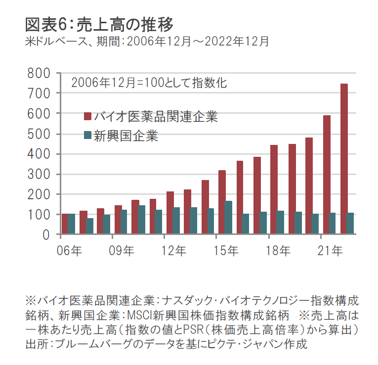 バイオ医薬品関連企業の売上高は、新興国の企業を上回って堅調に成長してきました。(図表6参照)