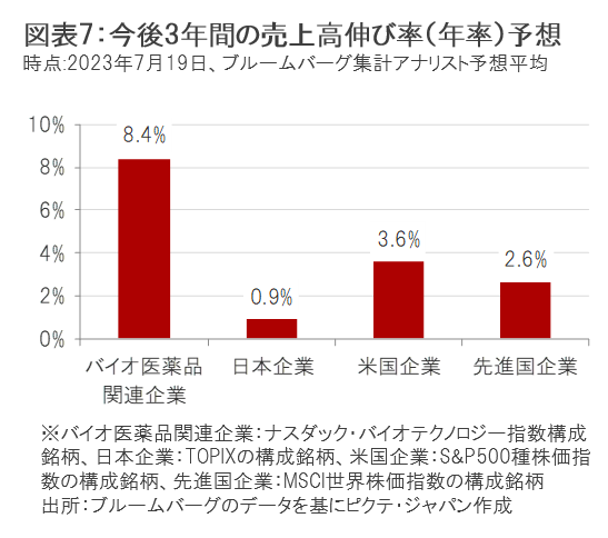 バイオ医薬品関連企業については、引き続き多くの有望な治療薬候補を有しており、新薬承認後の業績寄与が期待されていることから、今後3年間で年率+8.4%の相対的に高い売上高の伸びが予想されています。(図表7参照)
