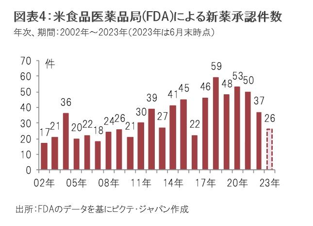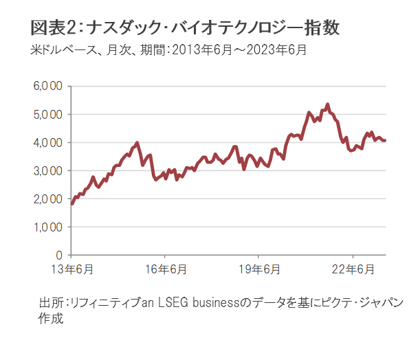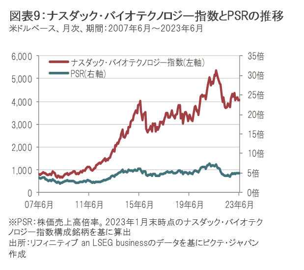 バイオ医薬品企業の業績が景気動向に左右されにくい特性などが注目されて2021年夏頃までは株価が上昇し、PSR(株価売上高倍率)で見たバリュエーション(投資価値評価)の水準も上昇していましたが、2021年秋以降はFDAの承認申請に対する予想外の決定などがマイナス要因となったことに加え、2022年半ばにかけてナスダック市場の下落が大きくなる中、ナスダック・バイオテクノロジー指数も下落したことから、PSRも低下しました。(図表9参照)