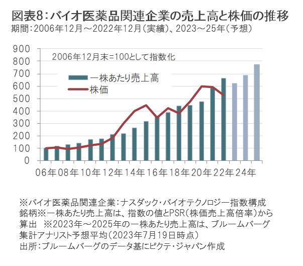 過去の実績では、バイオ医薬品関連企業の株価は、売上高の伸びとともに上昇してきたことがわかります。(図表8参照)
