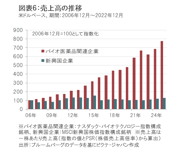 バイオ医薬品関連企業の売上高は、新興国の企業を上回って堅調に成長してきました。(図表6参照)