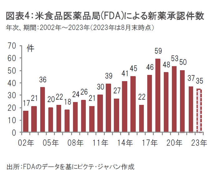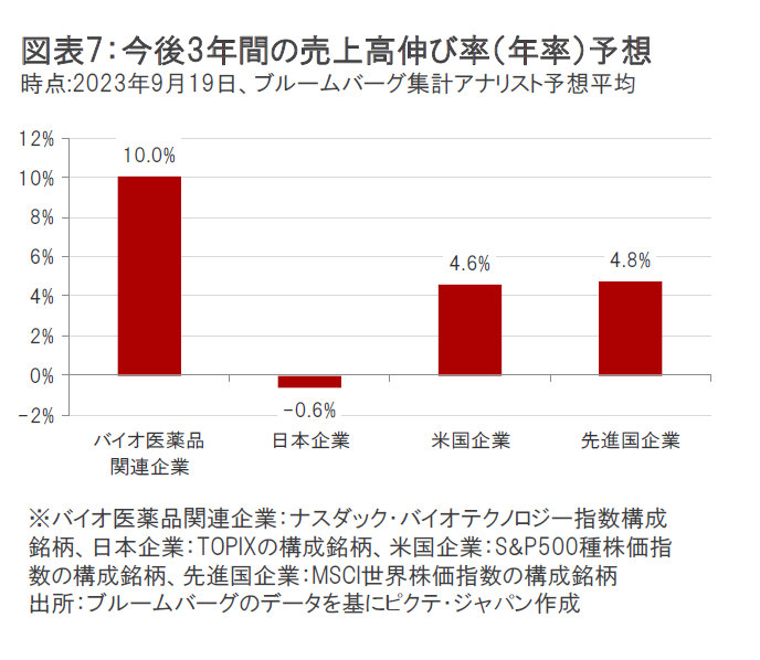 バイオ医薬品関連企業については、引き続き多くの有望な治療薬候補を有しており、新薬承認後の業績寄与が期待されていることから、今後3年間で年率+10%の相対的に高い売上高の伸びが予想されています。(図表7参照)