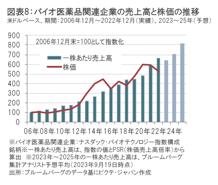 過去の実績では、バイオ医薬品関連企業の株価は、売上高の伸びとともに上昇してきたことがわかります。(図表8参照)