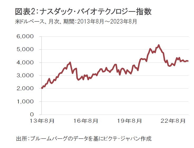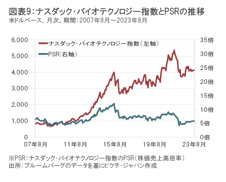 バイオ医薬品企業の業績が景気動向に左右されにくい特性などが注目されて2021年夏頃までは株価が上昇し、PSR(株価売上高倍率)で見たバリュエーション(投資価値評価)の水準も上昇していましたが、2021年秋以降はFDAの承認申請に対する予想外の決定などがマイナス要因となったことに加え、2022年半ばにかけてナスダック市場の下落が大きくなる中、ナスダック・バイオテクノロジー指数も下落したことから、PSRも低下しました。(図表9参照)
