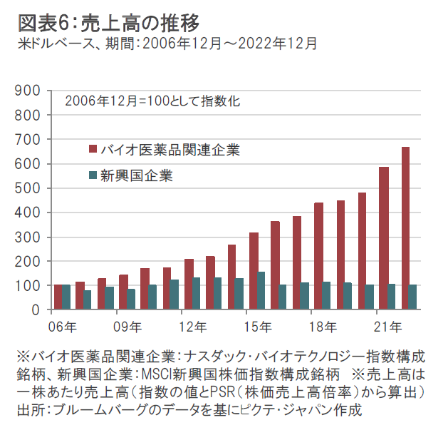 バイオ医薬品関連企業の売上高は、新興国の企業を上回って堅調に成長してきました。(図表6参照)