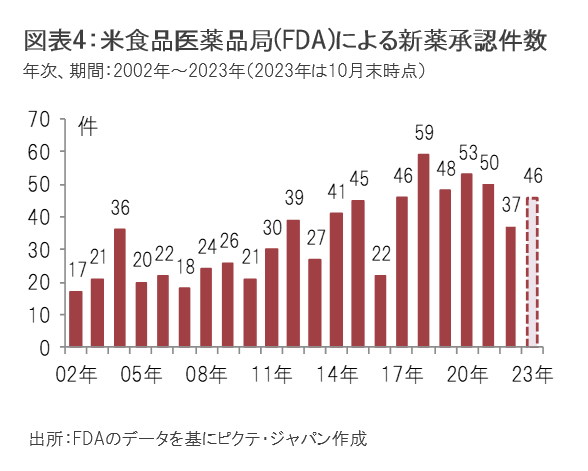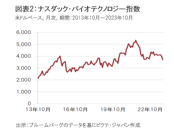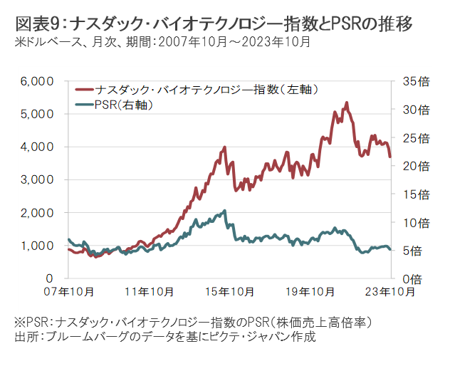 バイオ医薬品企業の業績が景気動向に左右されにくい特性などが注目されて2021年夏頃までは株価が上昇し、PSR(株価売上高倍率)で見たバリュエーション(投資価値評価)の水準も上昇していましたが、2021年秋以降はFDAの承認申請に対する予想外の決定などがマイナス要因となったことに加え、2022年半ばにかけてナスダック市場の下落が大きくなる中、ナスダック・バイオテクノロジー指数も下落したことから、PSRも低下しました。(図表9参照)