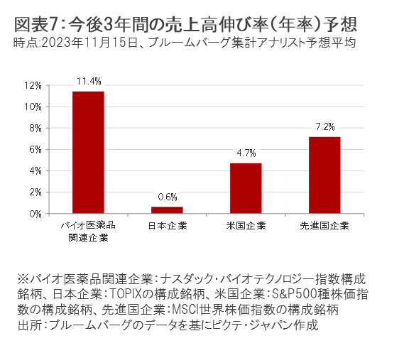 バイオ医薬品関連企業については、引き続き多くの有望な治療薬候補を有しており、新薬承認後の業績寄与が期待されていることから、今後3年間で年率+11.4%の相対的に高い売上高の伸びが予想されています。(図表7参照)