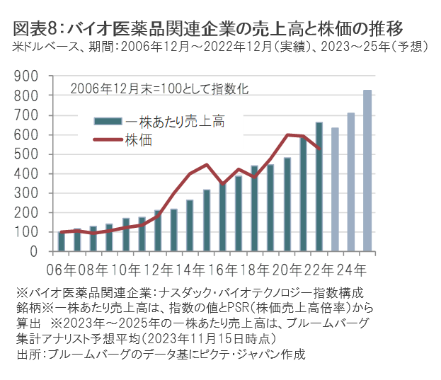 過去の実績では、バイオ医薬品関連企業の株価は、売上高の伸びとともに上昇してきたことがわかります。(図表8参照)