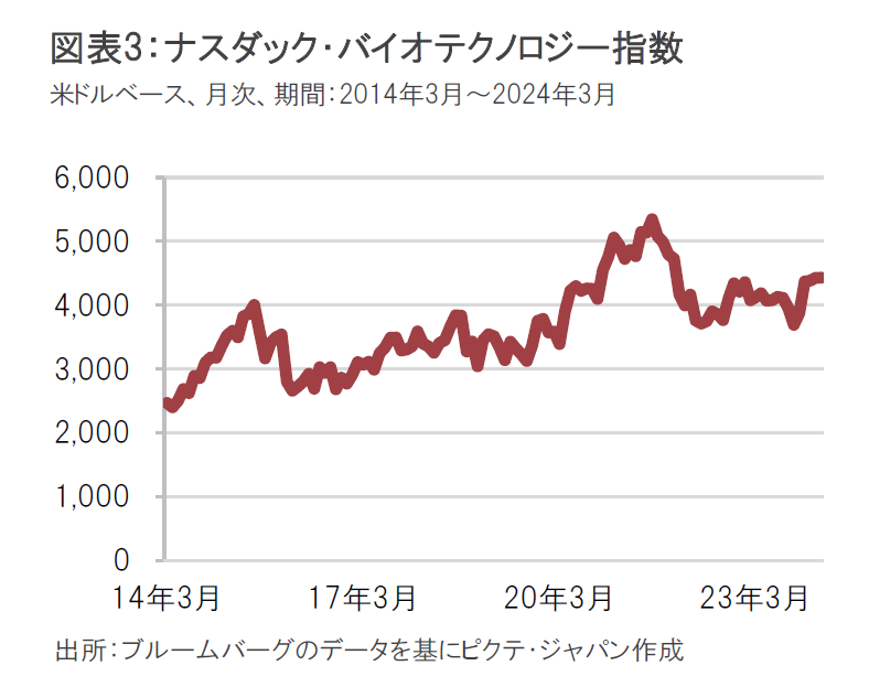 2023年11月から2月にかけての上昇が一段落しました。中でも中小型株は、大型株に比べ相対的に軟調な動きとなりました。一方で、バイオ医薬品業界のファンダメンタルズは非常に健全な状況にあり、バイオ医薬品株式の売買も高水準となり、新規株式公開(IPO)も小規模ながら戻ってきています。さらに中小型銘柄については、支出に対して慎重な傾向が続いており、財務状況の健全性は高いとみています。
