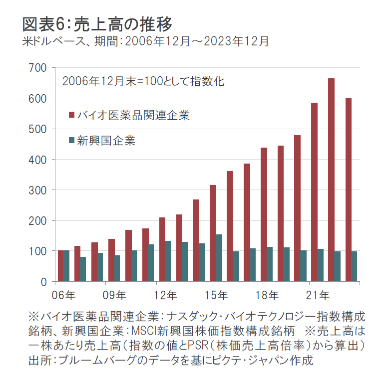 バイオ医薬品関連企業の売上高は、新興国の企業を上回って堅調に成長してきました。(図表6参照)