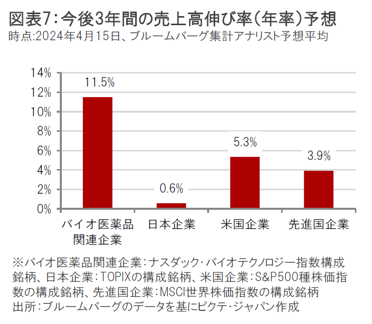 バイオ医薬品関連企業については、引き続き多くの有望な治療薬候補を有しており、新薬承認後の業績寄与が期待されていることから、今後3年間で年率+11.5%の相対的に高い売上高の伸びが予想されています。(図表7参照)