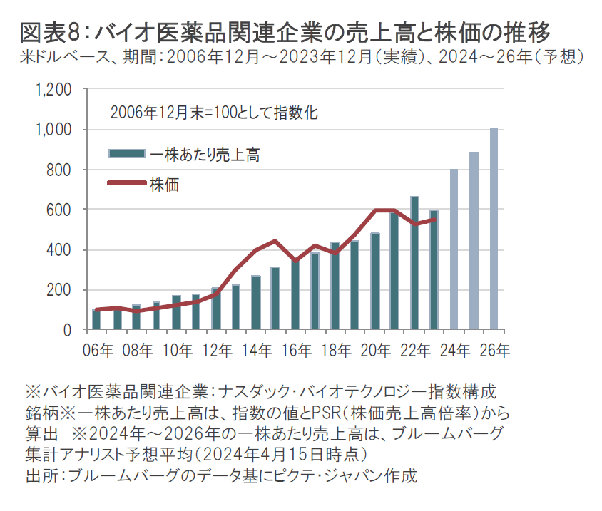 過去の実績では、バイオ医薬品関連企業の株価は、売上高の伸びとともに上昇してきたことがわかります。(図表8参照)