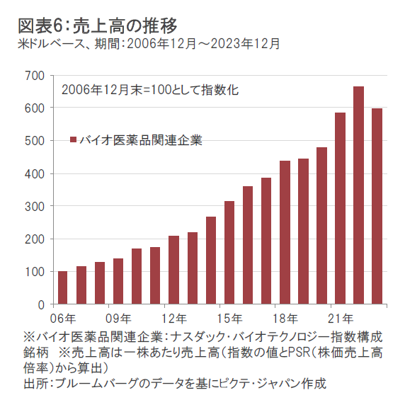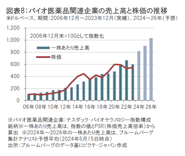 過去の実績では、バイオ医薬品関連企業の株価は、売上高の伸びとともに上昇してきたことがわかります。(図表8参照)