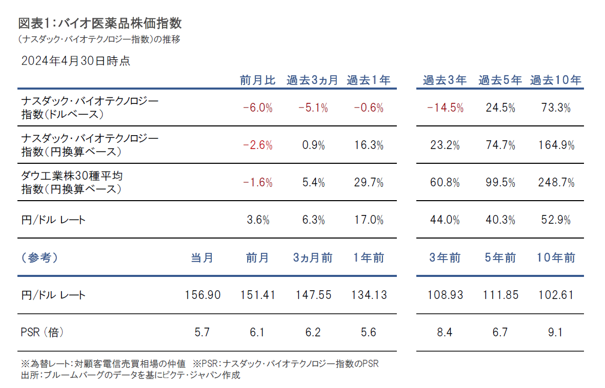 4月のナスダック・バイオテクノロジー指数(ドルベース、配当含まず)は、下落しました。