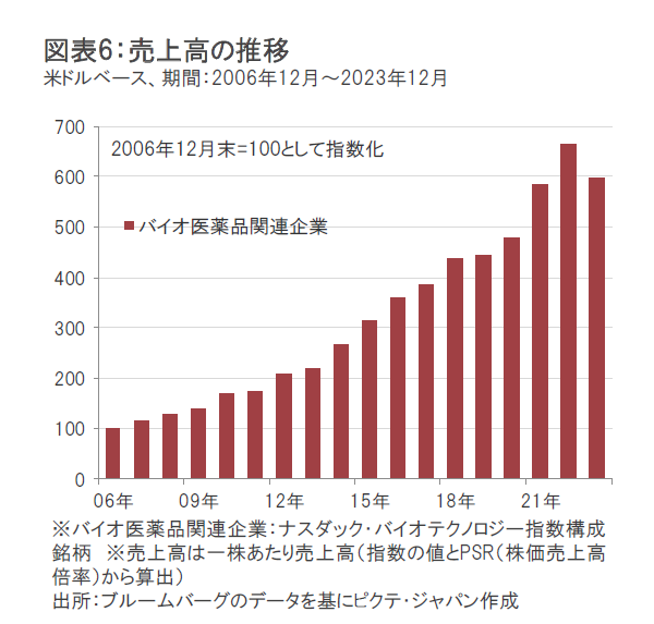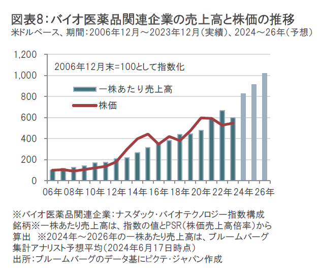 過去の実績では、バイオ医薬品関連企業の株価は、売上高の伸びとともに上昇してきたことがわかります。(図表8参照)