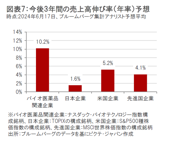 バイオ医薬品関連企業の売上高は、堅調に成長してきました。(図表6参照)バイオ医薬品関連企業については、引き続き多くの有望な治療薬候補を有しており、新薬承認後の業績寄与が期待されていることから、今後3年間で年率+10.2%の相対的に高い売上高の伸びが予想されています。(図表7参照)
