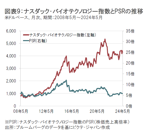 バイオ医薬品企業の業績が景気動向に左右されにくい特性などが注目されて2021年夏頃までは株価が上昇し、PSR(株価売上高倍率)で見たバリュエーション(投資価値評価)の水準も上昇していましたが、2021年秋以降は新薬承認申請に対するFDAの予想外の決定などがマイナス要因となったことに加え、2022年半ばにかけてナスダック市場の下落が大きくなる中、ナスダック・バイオテクノロジー指数も下落したことから、PSR も低下しました。( 図表9 参照)
