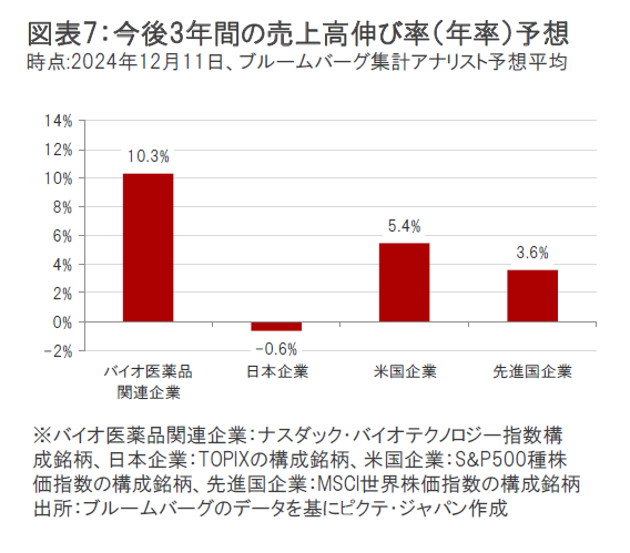 バイオ医薬品関連企業の売上高は、堅調に成長してきました。(図表6参照)バイオ医薬品関連企業については、引き続き多くの有望な治療薬候補を有しており、新薬承認後の業績寄与が期待されていることから、今後3年間で年率+10.3%の相対的に高い売上高の伸びが予想されています。(図表7参照)
