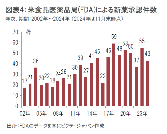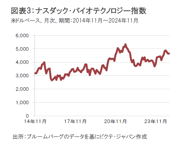 2024年のバイオ医薬品株式市場は、米国金利の変動や米国の大統領選挙とその後の閣僚人事などの影響を受けて、変動が大きくなりました。このような状況下、バイオ医薬品株式市場には、少しずつ良い兆候がみられると考えます。2023年に大型案件が多くみられたM&A(合併・買収)の動きは、大手の医薬品企業が大型治療薬の特許問題に直面していることもあり、今後も継続するものとみられ、2025年半ばまでには、再び案件の増加が期待されます。特にフェーズ2で良好な治験結果が示された治療薬候補を有するなど買収後のリスクの低い銘柄が注目されます。新薬の開発では、画期的な新薬の開発が続いており、AI(人工知能)の進化が、さらに開発を加速するとみています。また資金調達については、新薬の開発が順調な企業では引き続きスムーズに進められています。一方、IPOは依然として低調な状況が続いています。引き続き米国の金融政策、マクロ経済の動向、2025年に発足するトランプ新政権の政策動向には注視が必要と考えます。