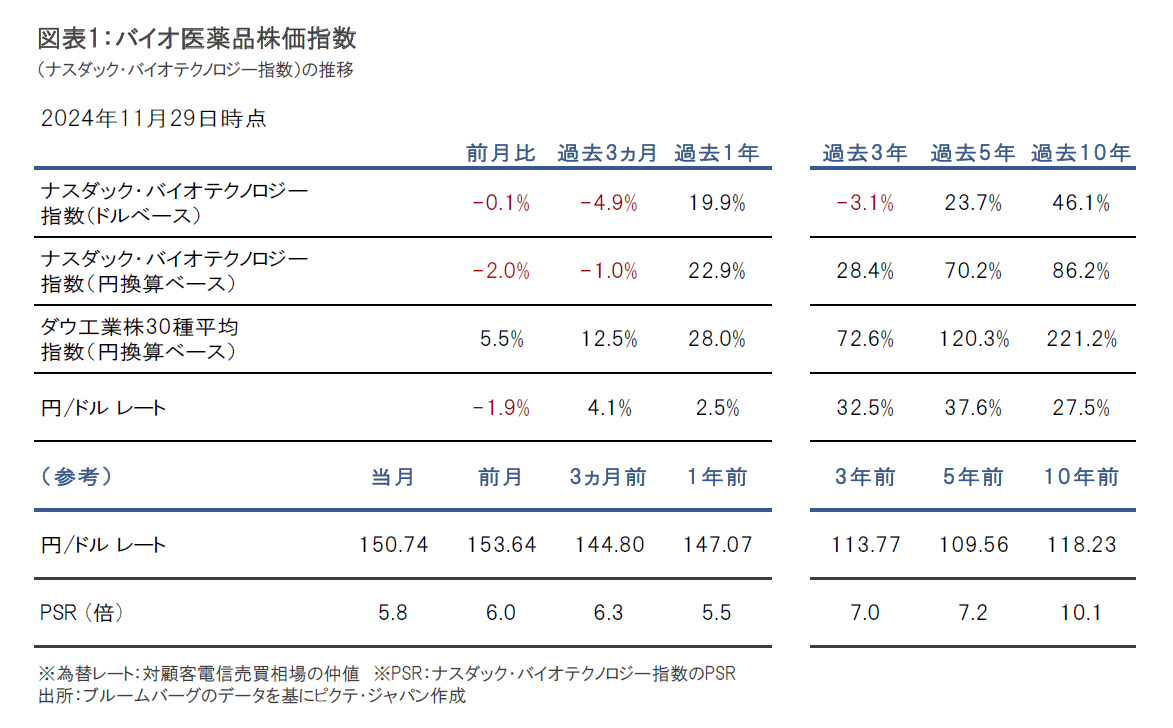 世界の株式市場は、米国大統領選挙でトランプ氏が勝利し、トランプ次期政権による規制緩和政策などが経済成長を促すとの見方などを背景に上昇しました。一方、バイオ医薬品株式は、トランプ新政権でワクチン懐疑論者であるロバート・ケネディ・ジュニア氏の保健福祉省長官起用が発表されたことを受けて、ヘルスケア株式全体が軟調な動きとなる中、一時、大きく下落しました。その後は、次第に懸念が和らぐ中でバイオ医薬品株式は反発しましたが、月間では下落となりました。