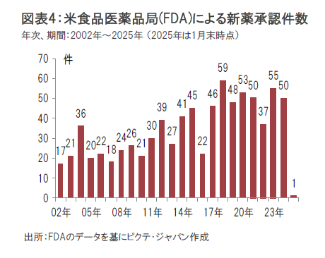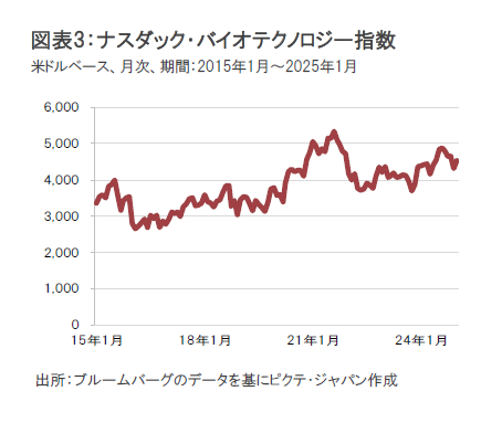 2024年のバイオ医薬品株式市場は、米国金利の変動や米国の大統領選挙とその後の閣僚人事などの影響を受けて、変動が大きくなりました。2023年に大型案件が多くみられたM&A(合併・買収)の動きは、大手の医薬品企業や大手のバイオ医薬品企業が大型治療薬の特許問題に直面していることもあり、今後も継続するものとみられ、2025年半ばまでには、再び案件の増加が期待されます。特にフェーズ2で良好な治験結果が示された治療薬候補を有するなど買収後のリスクの低い銘柄が注目されます。新薬の開発では、画期的な新薬の開発が続いており、AIの進化が、さらに開発を加速するとみています。また米食品医薬品局(FDA)が、医療ニーズが満たされていない適応症の治験については柔軟な姿勢を示していることも治療薬の開発を支援するものと考えます。さらに、資金調達については、新薬の開発が順調な企業では引き続きスムーズに進められています。一方、IPOは依然として低調な状況が続いています。引き続き米国の金融政策、マクロ経済の動向、トランプ新政権の政策動向には注視が必要と考えます。