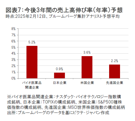 バイオ医薬品関連企業の売上高は、堅調に成長してきました。(図表6参照)バイオ医薬品関連企業については、引き続き多くの有望な治療薬候補を有しており、新薬承認後の業績寄与が期待されていることから、今後3年間で年率+5.2%の相対的に高い売上高の伸びが予想されています。(図表7参照)