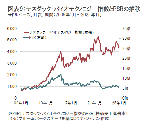 バイオ医薬品企業の業績が景気動向に左右されにくい特性などが注目されて2021年夏頃までは株価が上昇し、PSR(株価売上高倍率)で見たバリュエーション(投資価値評価)の水準も上昇していましたが、2021年秋以降は新薬承認申請に対するFDAの予想外の決定などがマイナス要因となったことに加え、2022年半ばにかけてナスダック市場の下落が大きくなる中、ナスダック・バイオテクノロジー指数も下落したことからPSRも低下し、その後、低水準で推移しています。(図表9参照)
