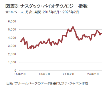 バイオ医薬品株式市場は、米国金利の変動や景気見通しの不透明感などの影響を受けて、変動が大きくなっています。2023年に大型案件が多くみられたM&Aの動きは、大手の医薬品企業や大手のバイオ医薬品企業が大型治療薬の特許問題に直面していることもあり、今後も継続するものとみられ、2025年半ばまでには、再び案件の増加が期待されます。特にフェーズ2で良好な治験結果が示された治療薬候補を有するなど買収後のリスクの低い銘柄が注目されます。新薬の開発では、画期的な新薬の開発が続いており、AI(人工知能)の進化が、さらに開発を加速するとみています。またFDAが、医療ニーズが満たされていない適応症の治験については柔軟な姿勢を示していることも治療薬の開発を支援するものと考えます。さらに、資金調達については、新薬の開発が順調な企業では引き続きスムーズに進められています。一方、IPOは依然として低調な状況が続いています。引き続き米国の金融政策、マクロ経済の動向、トランプ新政権の政策動向には注視が必要と考えます。