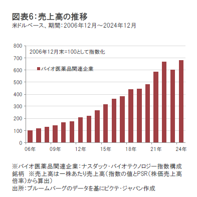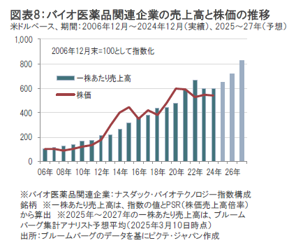 過去の実績では、バイオ医薬品関連企業の株価 は、売上高の伸びとともに上昇してきたことがわかります。(図表8参照)