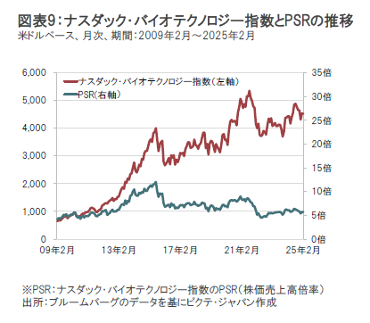 バイオ医薬品企業の業績が景気動向に左右されにくい特性などが注目されて2021年夏頃までは株価が上昇し、PSR(株価売上高倍率)で見たバリュエーション(投資価値評価)の水準も上昇していましたが、2021年秋以降は新薬承認申請に対するFDAの予想外の決定などがマイナス要因となったことに加え、2022年半ばにかけてナスダック市場の下落が大きくなる中、ナスダック・バイオテクノロジー指数も下落したことからPSRも低下し、その後、低水準で推移しています。(図表9参照)