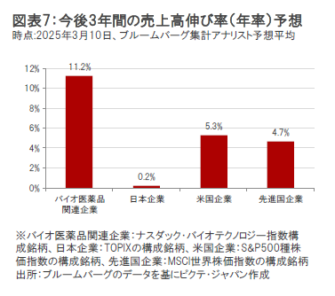 バイオ医薬品関連企業の売上高は、堅調に成長してきました。(図表6参照)バイオ医薬品関連企業については、引き続き多くの有望な治療薬候補を有しており、新薬承認後の業績寄与が期待されていることから、今後3年間で年率+11.2%の相対的に高い売上高の伸びが予想されています。(図表7参照)
