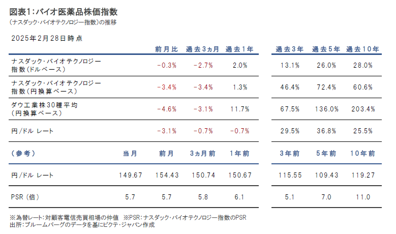 2月のナスダック・バイオテクノロジー指数(ドルベース、配当含まず)は下落しました。