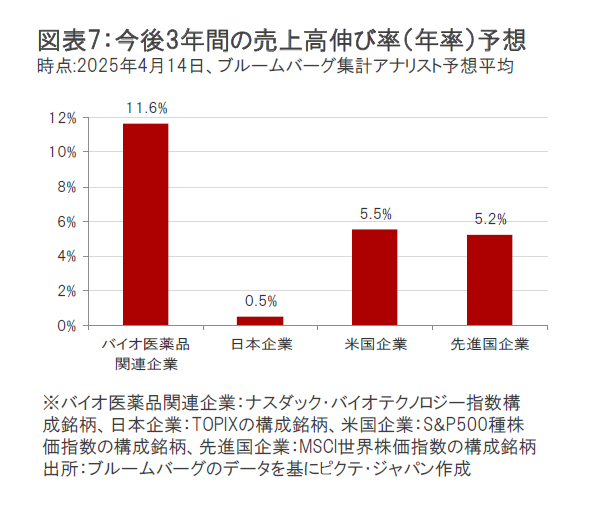 バイオ医薬品関連企業の売上高は、堅調に成長してきました。(図表6参照)バイオ医薬品関連企業については、引き続き多くの有望な治療薬候補を有しており、新薬承認後の業績寄与が期待されていることから、今後3年間で年率+11.6%の相対的に高い売上高の伸びが予想されています。(図表7参照)