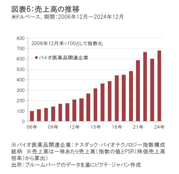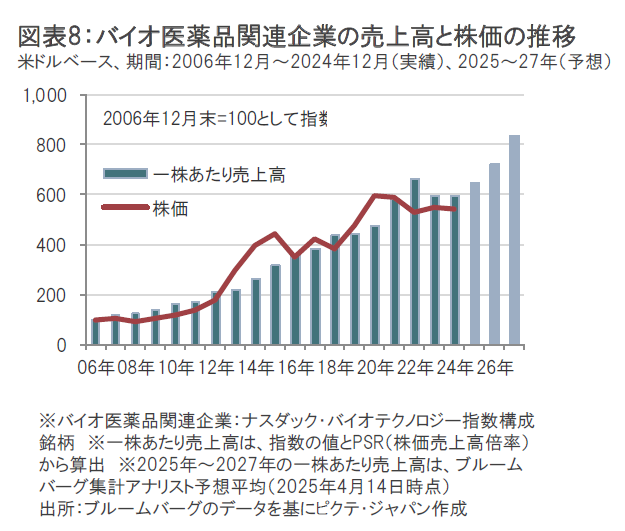 過去の実績では、バイオ医薬品関連企業の株価は、売上高の伸びとともに上昇してきたことがわかります。(図表8参照)