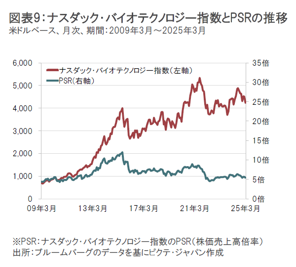 バイオ医薬品企業の業績が景気動向に左右されにくい特性などが注目されて2021年夏頃までは株価が上昇し、PSR(株価売上高倍率)で見たバリュエーション(投資価値評価)の水準も上昇していましたが、2021年秋以降は新薬承認申請に対するFDAの予想外の決定などがマイナス要因となったことに加え、2022年半ばにかけてナスダック市場の下落が大きくなる中、ナスダック・バイオテクノロジー指数も下落したことからPSRも低下し、その後、低水準で推移しています。(図表9参照)