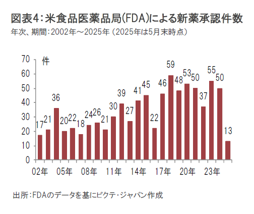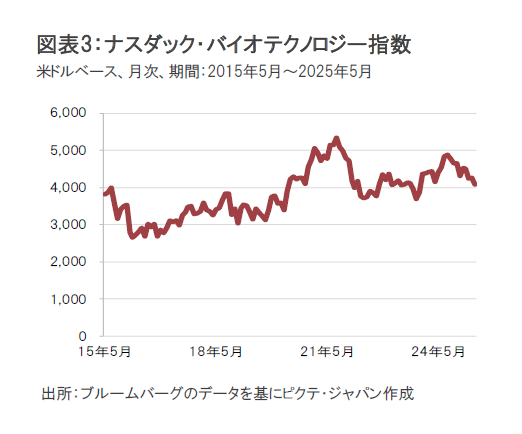 バイオ医薬品株式市場は、米国金利の変動や米トランプ政権の関税政策などを背景とした景気見通しの不透明感、FDAの再編の動き、薬価引き下げの動きへの懸念などの影響を受けて、変動が大きくなっています。2023年に大型案件が多くみられたM&A(合併・買収)の動きは、大手の医薬品企業や大手のバイオ医薬品企業が大型治療薬の特許問題に直面し、パイプラインの強化が求められていることから、今後、再び案件が増加することが期待されます。特にフェーズ2で良好な治験結果が示された治療薬候補を有するなど買収後のリスクの低い銘柄が注目されます。新薬の開発では、画期的な新薬の開発が続いており、AI (人工知能)の進化が、さらに開発を加速するとみています。
