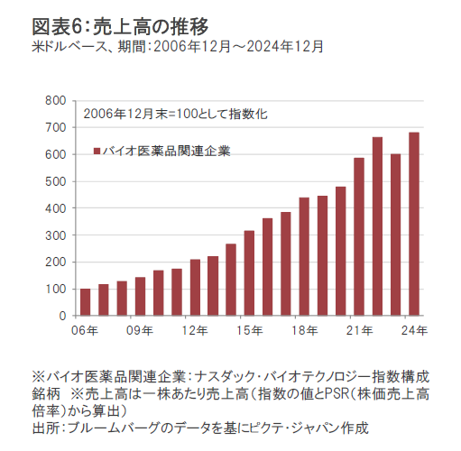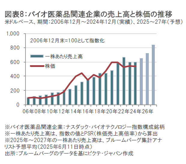 過去の実績では、バイオ医薬品関連企業の株価は、売上高の伸びとともに上昇してきたことがわかります。(図表8参照)