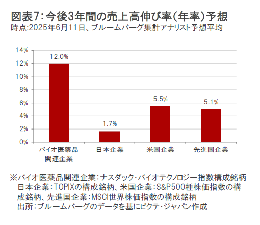 バイオ医薬品関連企業の売上高は、堅調に成長してきました。(図表6参照)バイオ医薬品関連企業については、引き続き多くの有望な治療薬候補を有しており、新薬承認後の業績寄与が期待されていることから、今後3年間で年率+12.0%の相対的に高い売上高の伸びが予想されています。(図表7参照)
