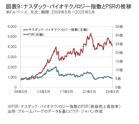 バイオ医薬品企業の業績が景気動向に左右されにくい特性などが注目されて2021年夏頃までは株価が上昇し、PSR(株価売上高倍率)で見たバリュエーション(投資価値評価)の水準も上昇していましたが、2021年秋以降は新薬承認申請に対するFDAの予想外の決定などがマイナス要因となったことに加え、2022年半ばにかけてナスダック市場の下落が大きくなる中、ナスダック・バイオテクノロジー指数も下落したことからPSRも低下し、その後、低水準で推移しています。(図表9参照)