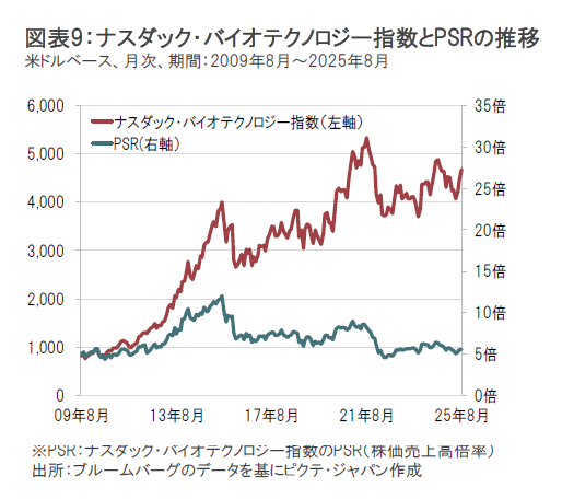 バイオ医薬品企業の業績が景気動向に左右されにくい特性などが注目されて2021年夏頃までは株価が上昇し、PSR(株価売上高倍率)で見たバリュエーション(投資価値評価)の水準も上昇していましたが、2021年秋以降は新薬承認申請に対するFDAの予想外の決定などがマイナス要因となったことに加え、2022年半ばにかけてナスダック市場の下落が大きくなる中、ナスダック・バイオテクノロジー指数も下落したことからPSRも低下し、その後、低水準で推移しています。(図表9参照)